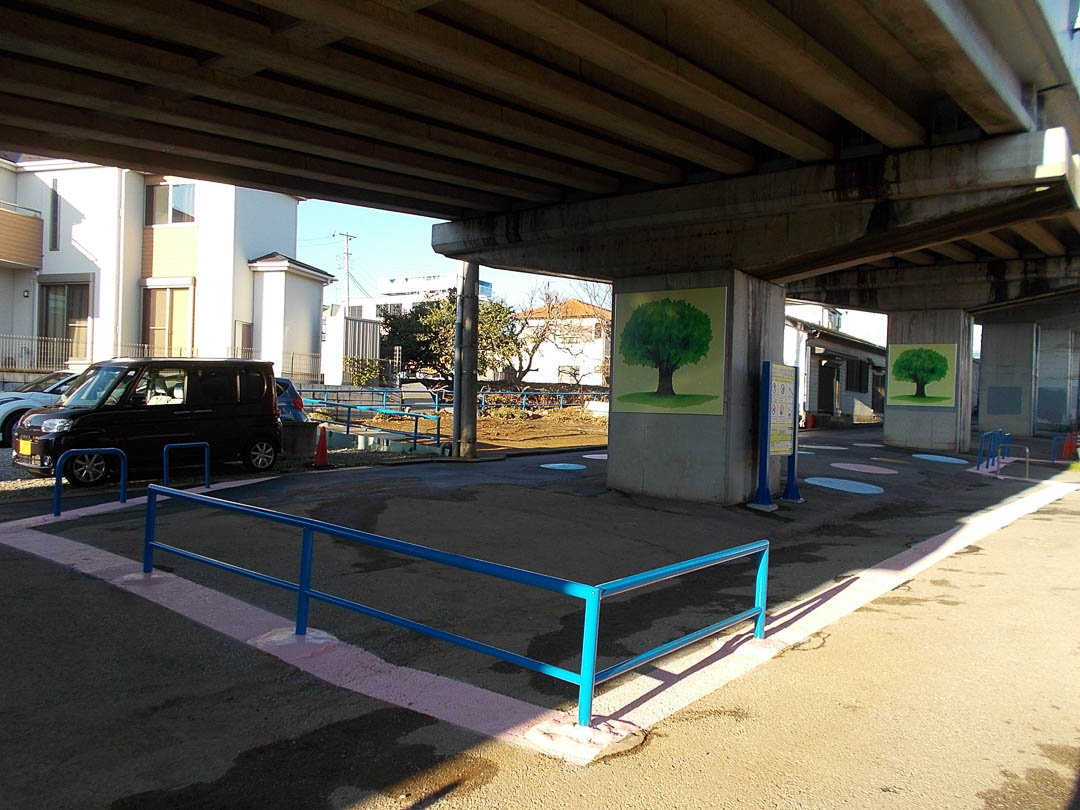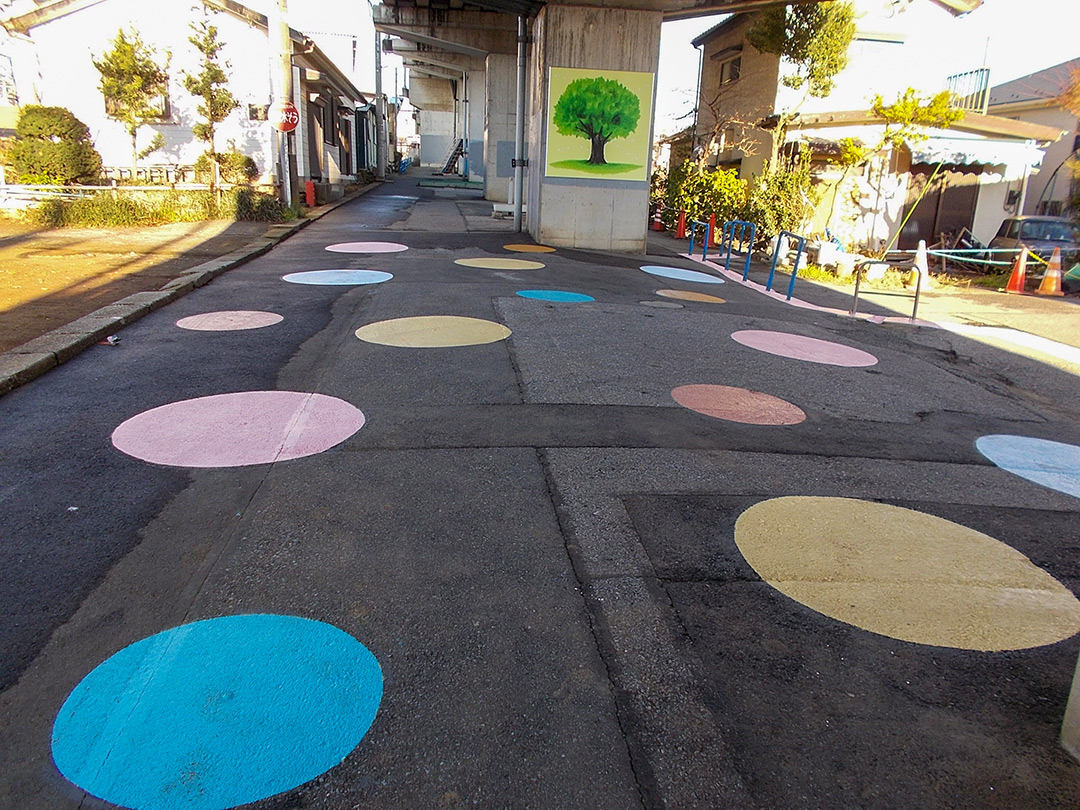 橋脚の下のコンクリート壁で囲まれた暗い雰囲気だった公園を、床面にカラフルな 塗装をし、壁面に明るいデザインのイラストをつけることで、楽しい気分になれる公園へと改修いたしました。 コンクリート面への塗装も行っておりますのでお問い合わせください。