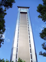 モザイクタイルでできている時計塔ですが、経年劣化によりモザイクがどんどん剥がれ落ち、大変危険な状態でした。本体支柱はそのままに表面をブロンズカラーのステンレス板に取替いたしました。
